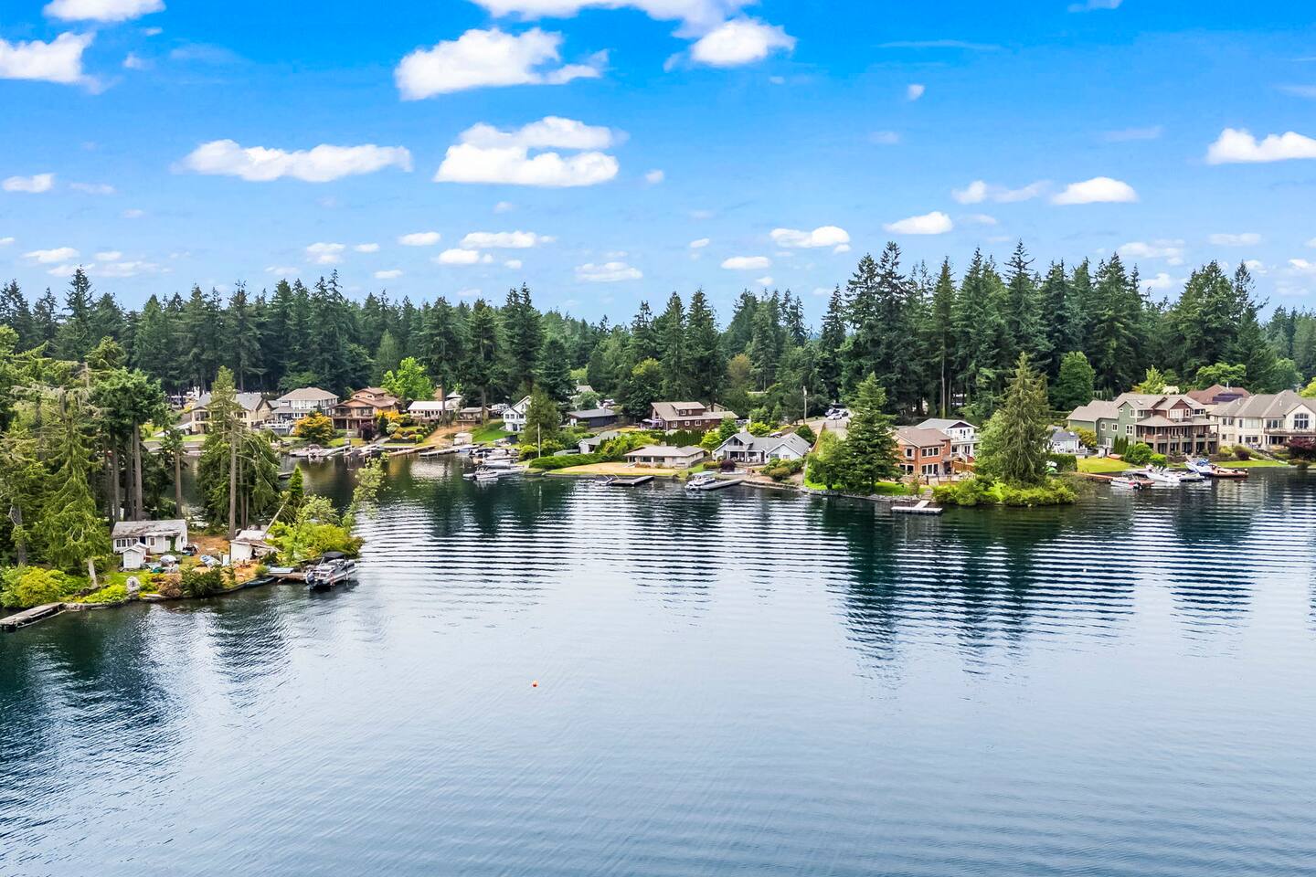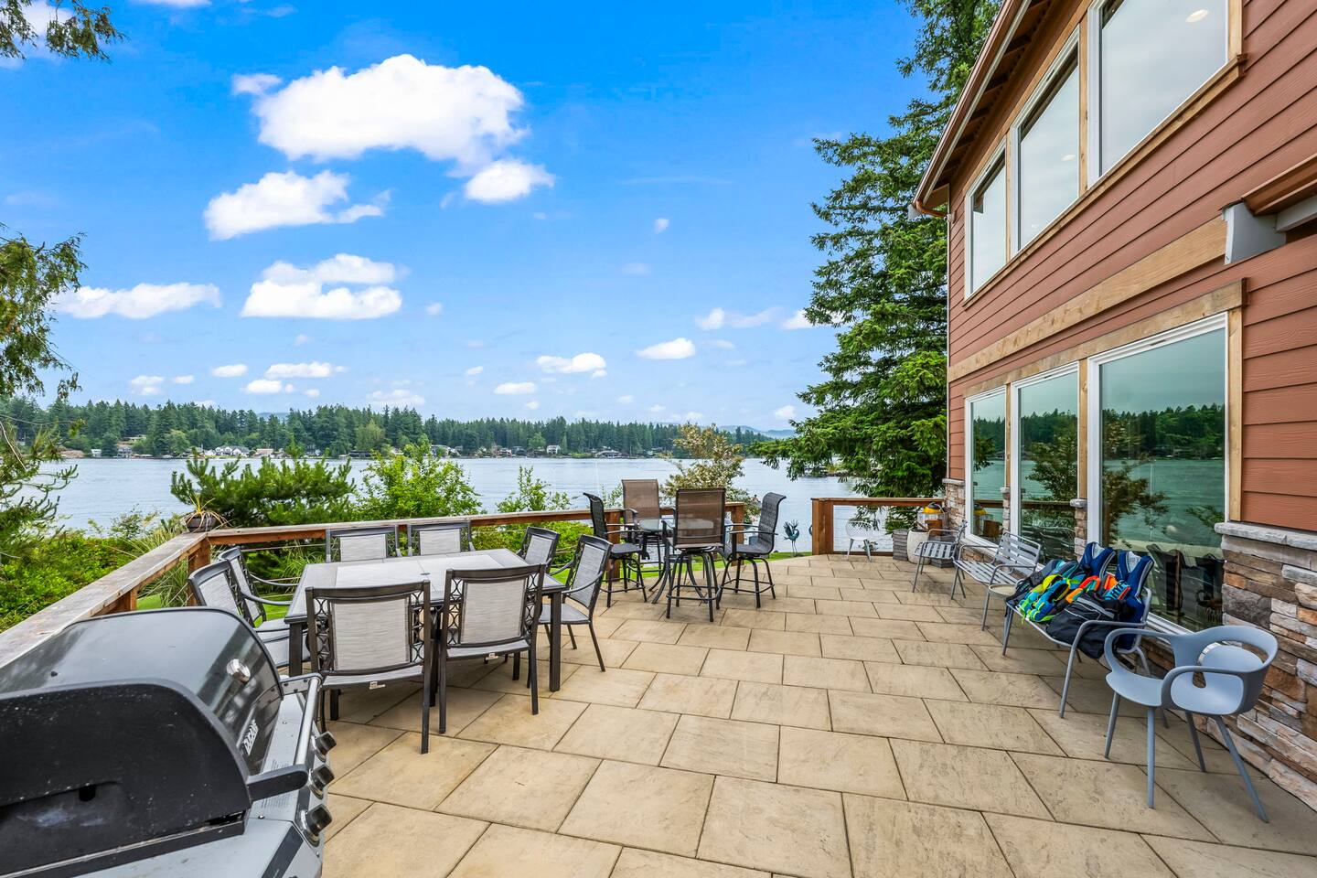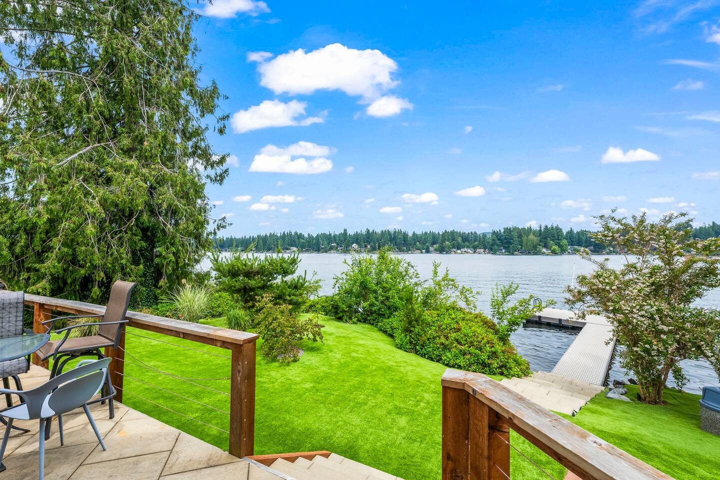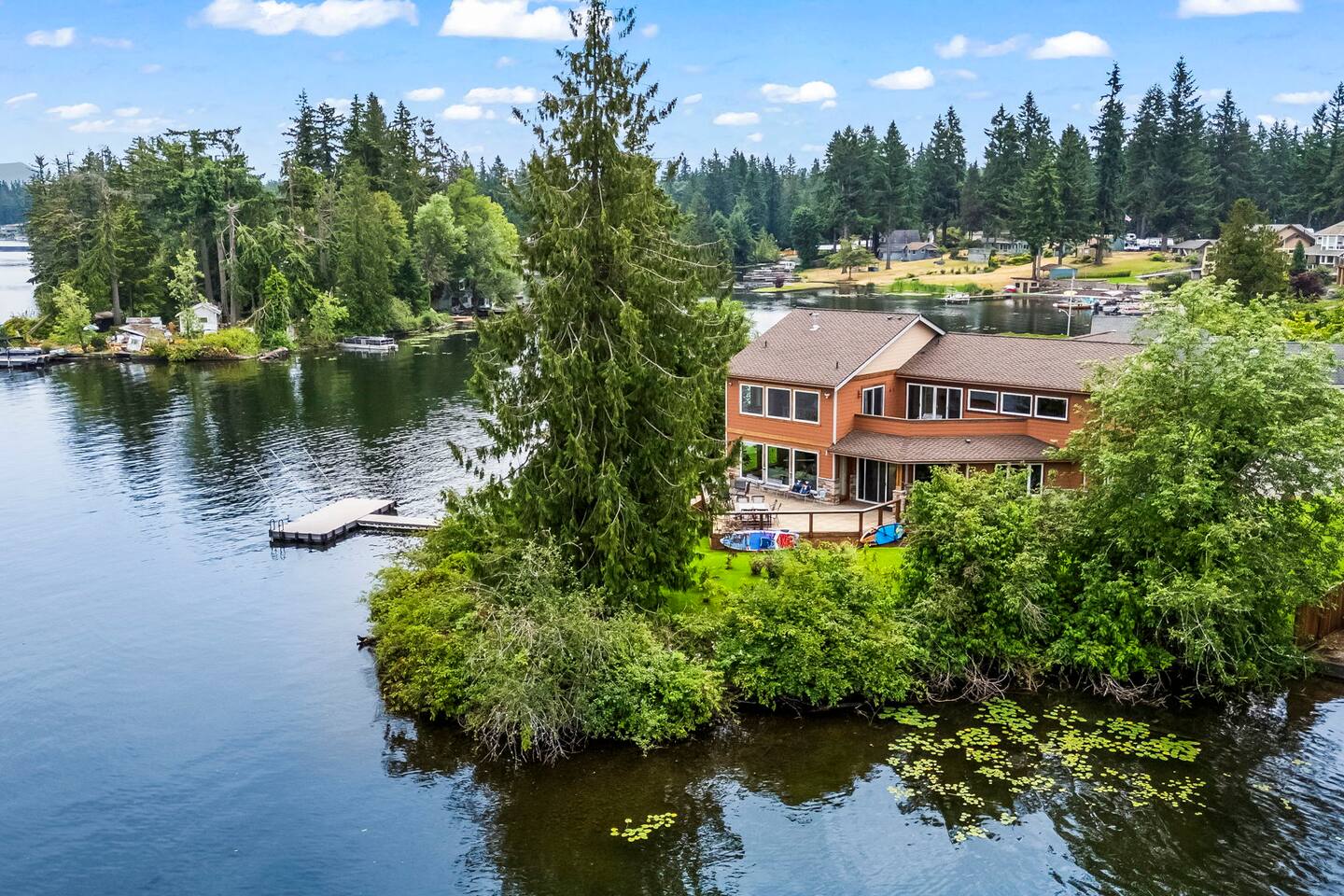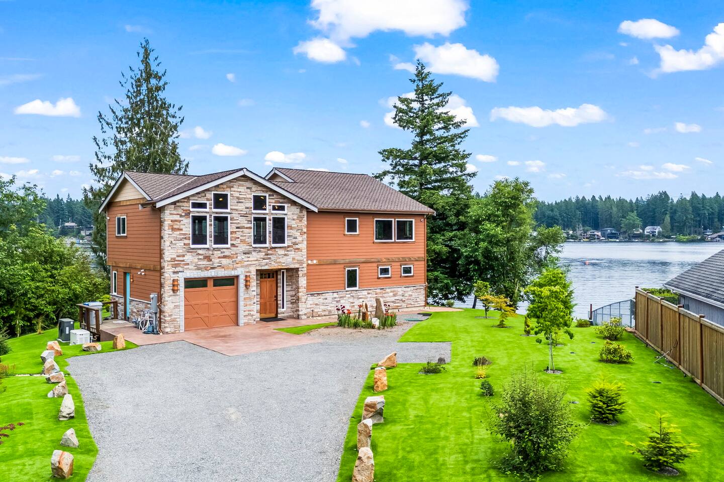 Relax and recharge in this thoughtfully crafted 2022 lodge where nature, luxury, and functionality come together. • 3 California King Suites – Spacious bedrooms with ensuite baths and custom touches • Murphy Bed in the Loft – Easily folds down for extra sleeping space • Lake-View Deck + Private Dock – Step out for coffee, a paddle, or just to soak in the view • Gas Fireplaces – One in the main living area and another in the primary suite for cozy evenings • 7 Smart TVs – Stream your favorites with ease in every room • Handcrafted Furniture + Local Art – Featuring copper accents inspired by the area's hawks • Fully Equipped Chef’s Kitchen – Stainless steel appliances, island seating, and all essentials • Second Kitchenette Upstairs – Great for morning coffee or evening drinks • Individual Coffee Stations – One in each bedroom for extra convenience • Central A/C + Whole-House Generator – Comfort and peace of mind in all seasons • Washer & Dryer on Each Floor – Ideal for longer or multi-family stays • Free Parking for 4 Vehicles – Includes easy access driveway and ramp entry • Wheelchair Friendly Home – Wider doorways, ramp, no-step entry, and walk-in shower Family-Ready Features • Grill Station – Fire up the BBQ for a lakeside feast • Lake Gear – Launch your paddle board or kayak from the private dock • Indoor/Outdoor Living – Designed for year-round connection with nature Wheel Chair Friendly • Main floor is completely wheelchair friendly, including the front entry which has no steps • The main floor bedroom and bathroom has a wheelchair friendly shower/tub • There are ramps to get to the backyard in a wheelchair as well BED CONFIGURATION • Bedroom 1 - California King size • Bedroom 2 - California King size • Bedroom 3 - California King size • Loft - Queen size and 2 toddler beds ☀ LAKE ACCESS & LOCAL ADVENTURES ☀ • Right on Lake Sawyer – Swim, paddle, or fish just steps from your deck • Black Diamond Bakery – A beloved local gem for breakfast or pies • Flaming Geyser State Park – Great for tubing, picnicking, or a scenic hike • Crystal Mountain & Mt. Rainier – Easy day trips for skiing, hiking, and alpine views