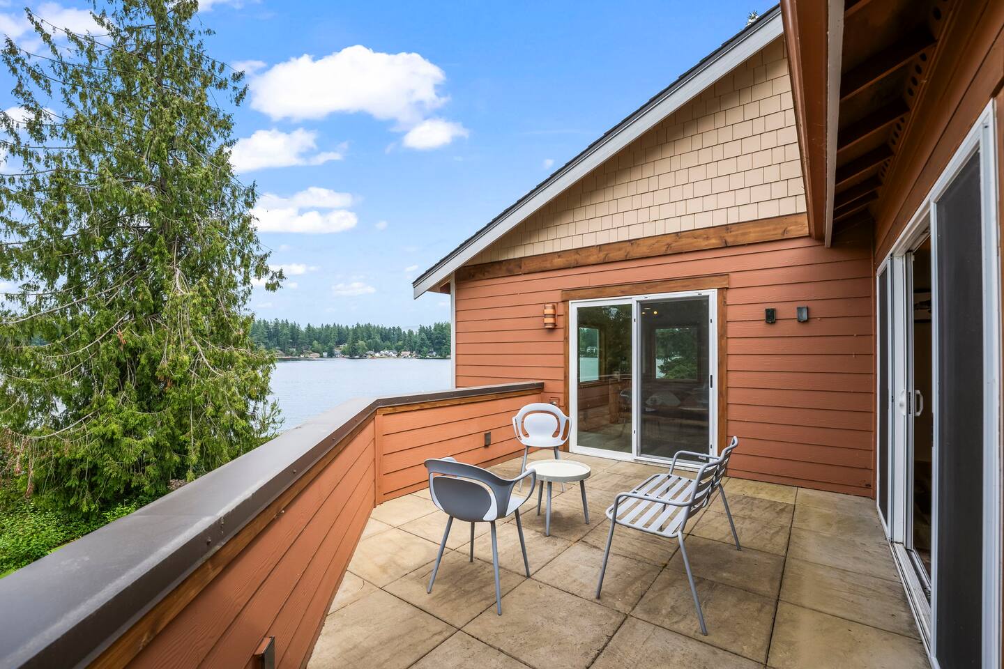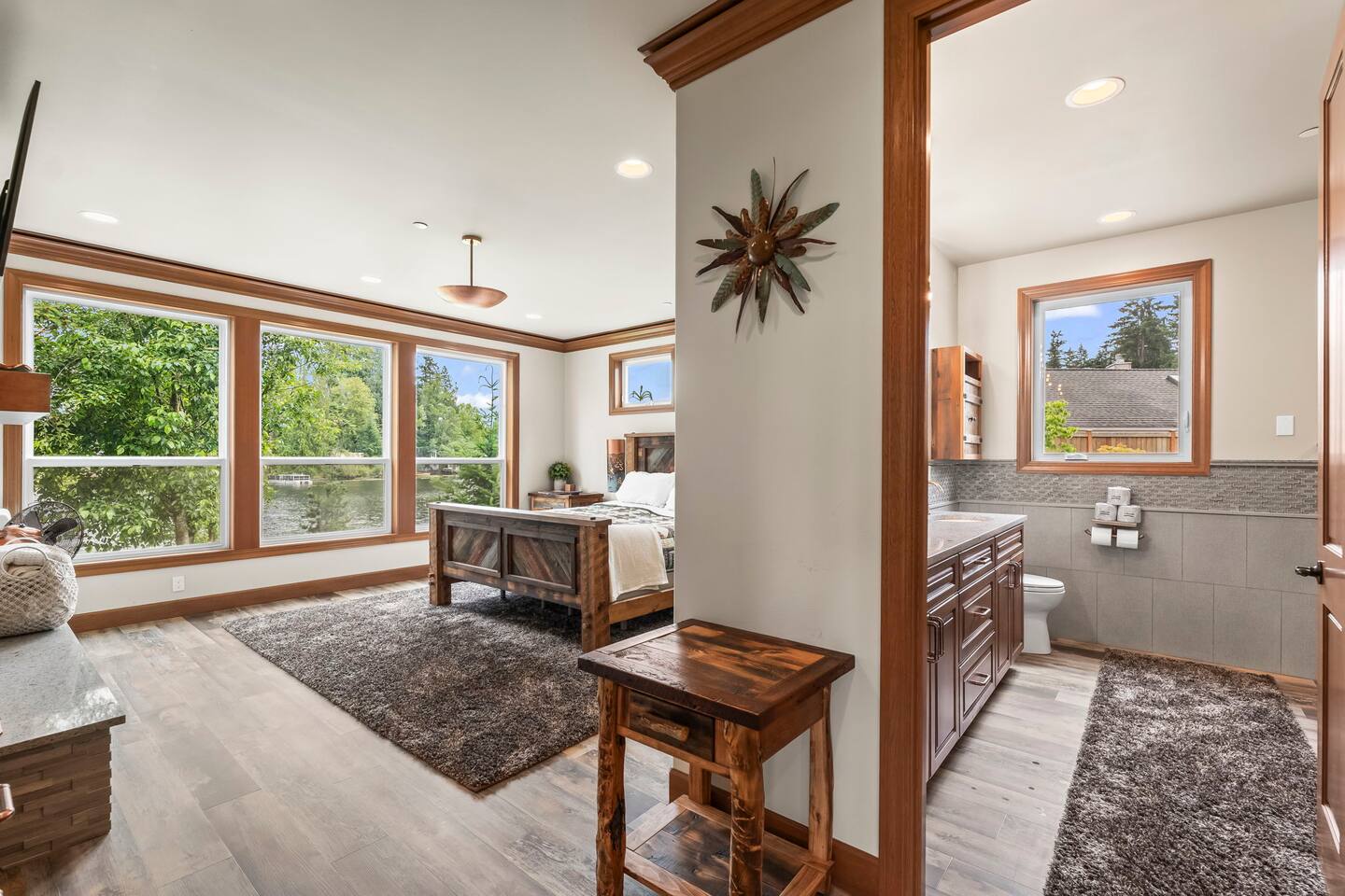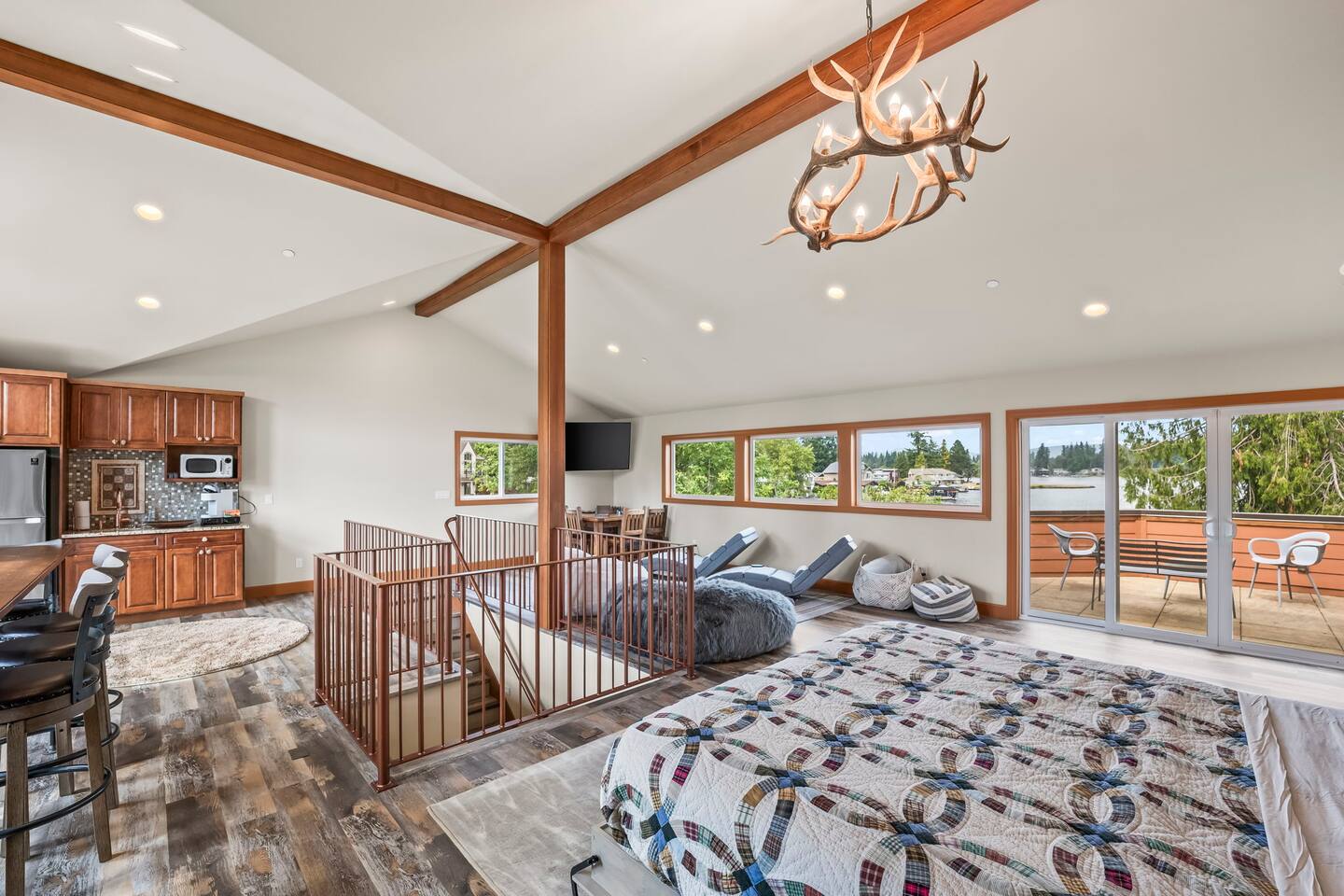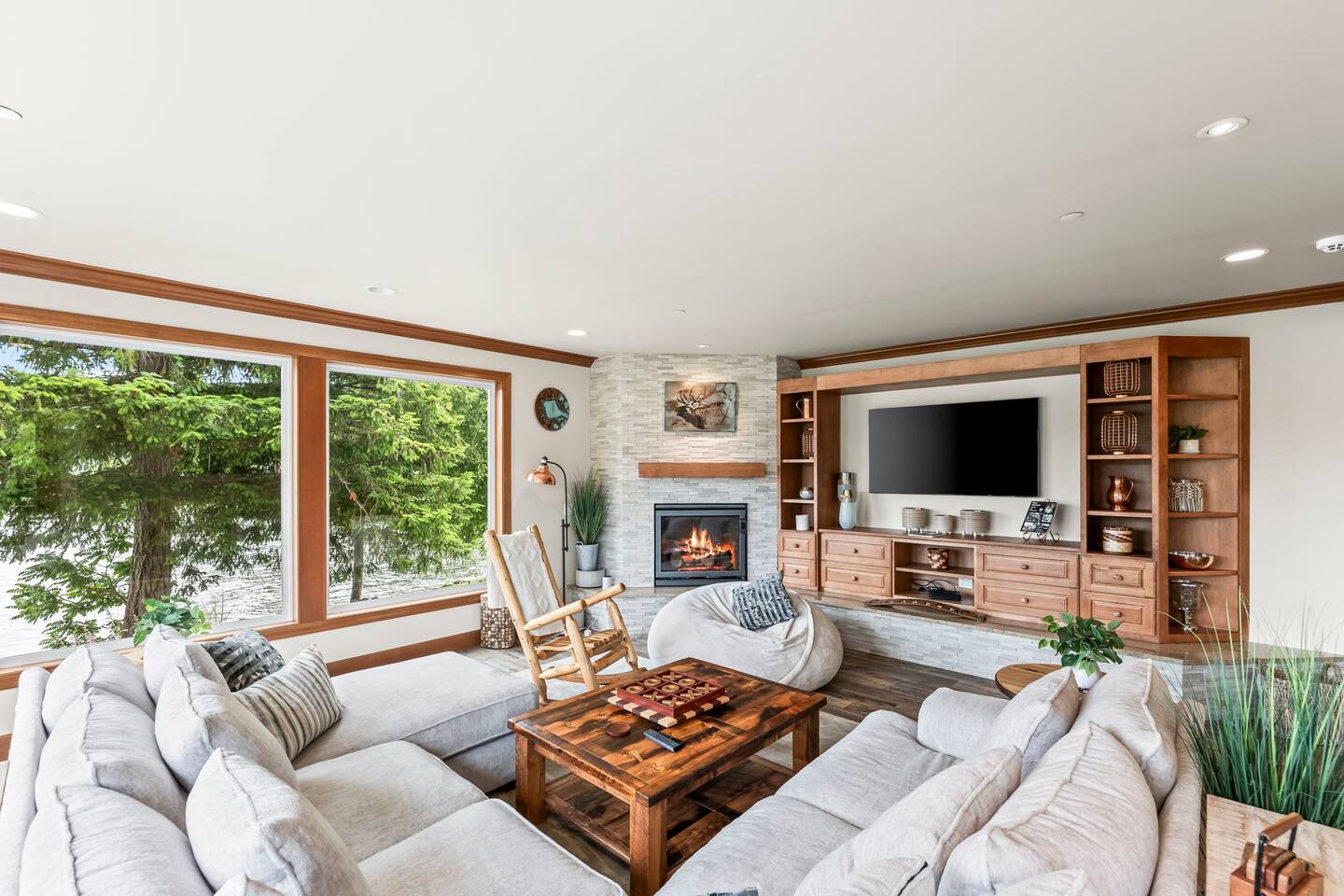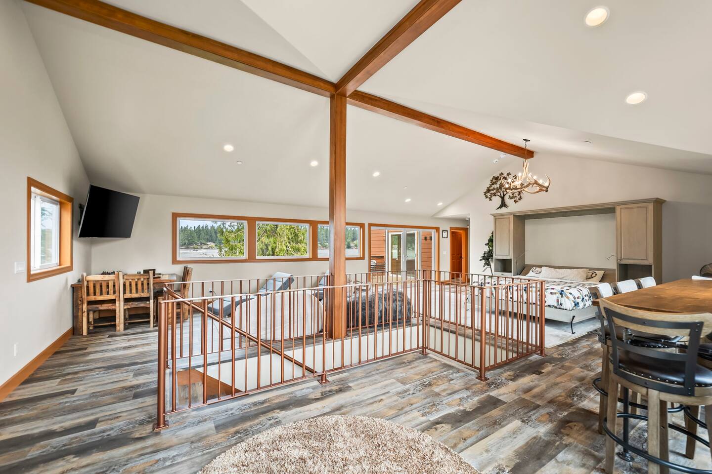 Relax and recharge in this thoughtfully crafted 2022 lodge where nature, luxury, and functionality come together. • 3 California King Suites – Spacious bedrooms with ensuite baths and custom touches • Murphy Bed in the Loft – Easily folds down for extra sleeping space • Lake-View Deck + Private Dock – Step out for coffee, a paddle, or just to soak in the view • Gas Fireplaces – One in the main living area and another in the primary suite for cozy evenings • 7 Smart TVs – Stream your favorites with ease in every room • Handcrafted Furniture + Local Art – Featuring copper accents inspired by the area's hawks • Fully Equipped Chef’s Kitchen – Stainless steel appliances, island seating, and all essentials • Second Kitchenette Upstairs – Great for morning coffee or evening drinks • Individual Coffee Stations – One in each bedroom for extra convenience • Central A/C + Whole-House Generator – Comfort and peace of mind in all seasons • Washer & Dryer on Each Floor – Ideal for longer or multi-family stays • Free Parking for 4 Vehicles – Includes easy access driveway and ramp entry • Wheelchair Friendly Home – Wider doorways, ramp, no-step entry, and walk-in shower Family-Ready Features • Grill Station – Fire up the BBQ for a lakeside feast • Lake Gear – Launch your paddle board or kayak from the private dock • Indoor/Outdoor Living – Designed for year-round connection with nature Wheel Chair Friendly • Main floor is completely wheelchair friendly, including the front entry which has no steps • The main floor bedroom and bathroom has a wheelchair friendly shower/tub • There are ramps to get to the backyard in a wheelchair as well BED CONFIGURATION • Bedroom 1 - California King size • Bedroom 2 - California King size • Bedroom 3 - California King size • Loft - Queen size and 2 toddler beds ☀ LAKE ACCESS & LOCAL ADVENTURES ☀ • Right on Lake Sawyer – Swim, paddle, or fish just steps from your deck • Black Diamond Bakery – A beloved local gem for breakfast or pies • Flaming Geyser State Park – Great for tubing, picnicking, or a scenic hike • Crystal Mountain & Mt. Rainier – Easy day trips for skiing, hiking, and alpine views