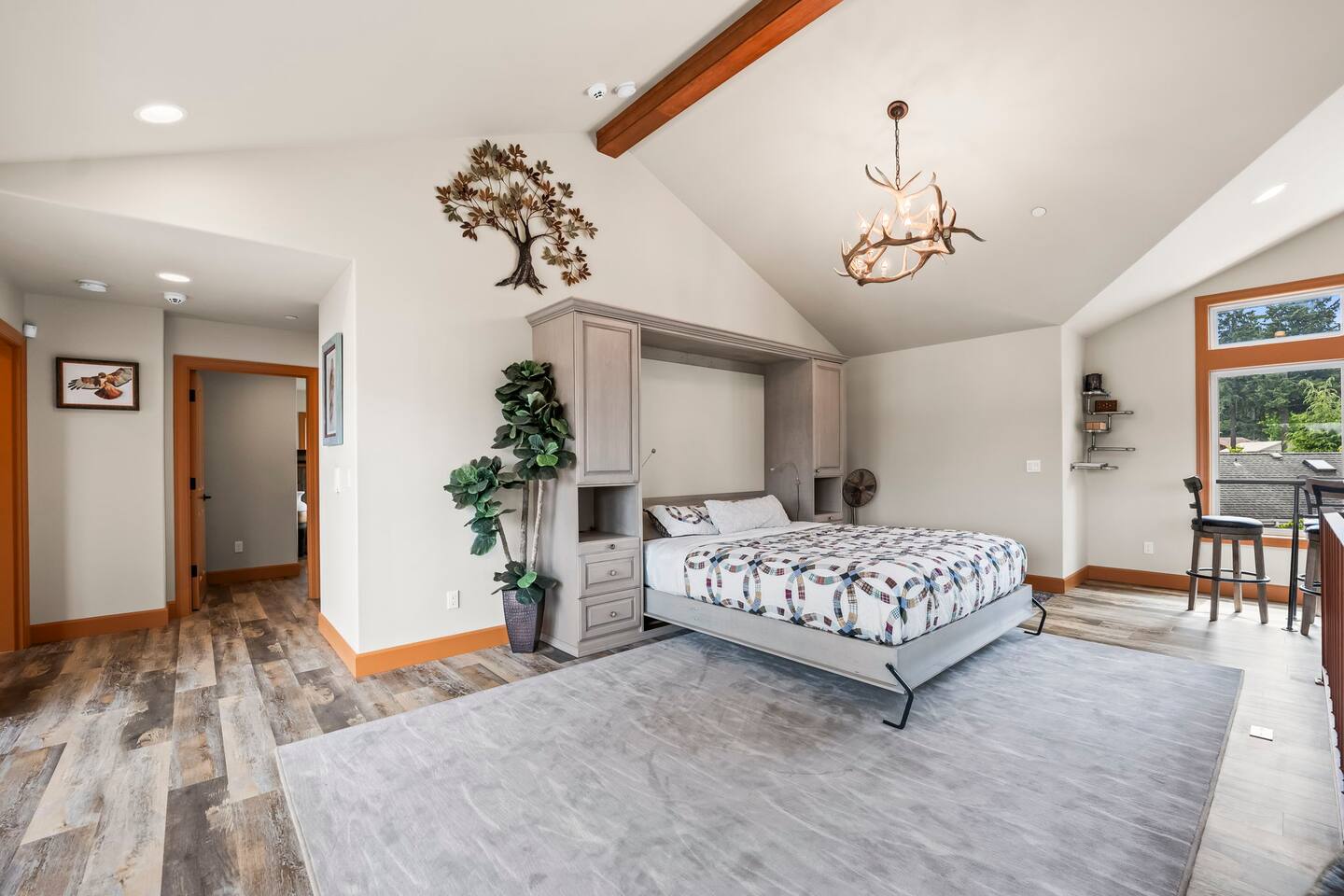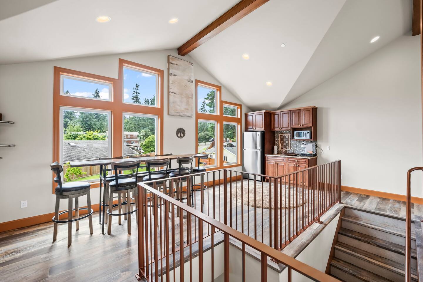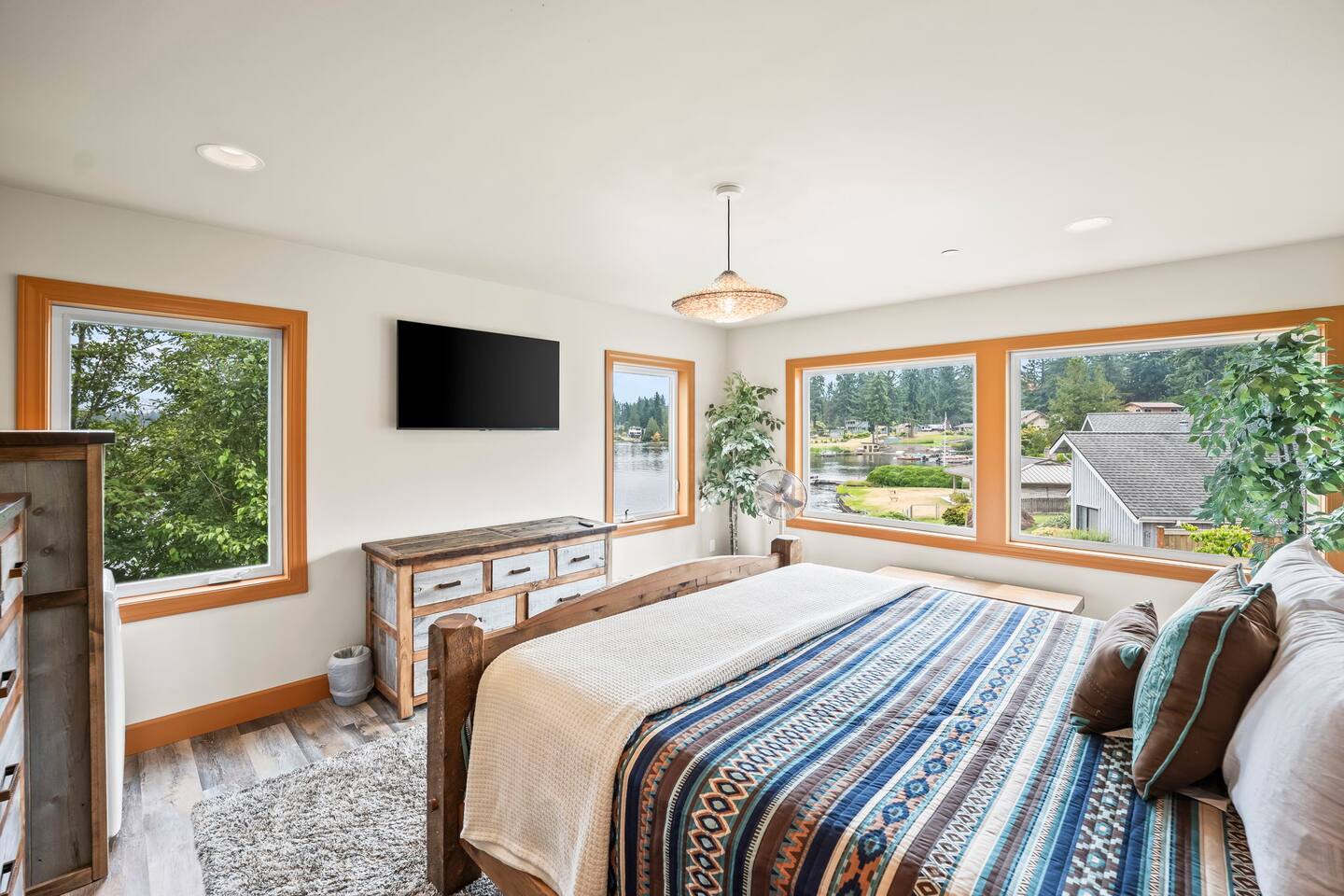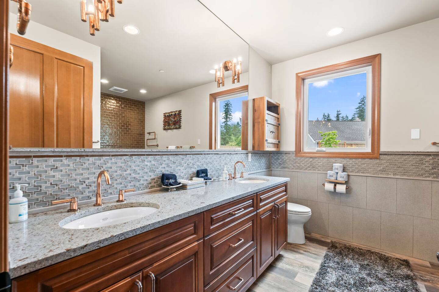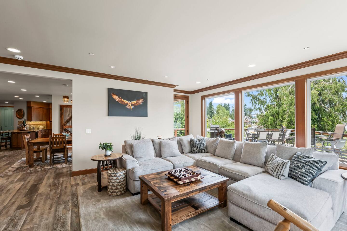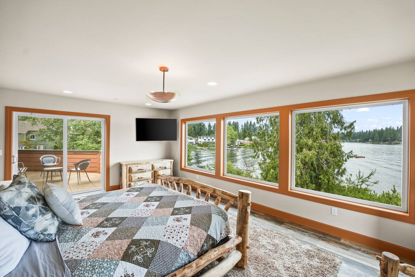 Relax and recharge in this thoughtfully crafted 2022 lodge where nature, luxury, and functionality come together. • 3 California King Suites – Spacious bedrooms with ensuite baths and custom touches • Murphy Bed in the Loft – Easily folds down for extra sleeping space • Lake-View Deck + Private Dock – Step out for coffee, a paddle, or just to soak in the view • Gas Fireplaces – One in the main living area and another in the primary suite for cozy evenings • 7 Smart TVs – Stream your favorites with ease in every room • Handcrafted Furniture + Local Art – Featuring copper accents inspired by the area's hawks • Fully Equipped Chef’s Kitchen – Stainless steel appliances, island seating, and all essentials • Second Kitchenette Upstairs – Great for morning coffee or evening drinks • Individual Coffee Stations – One in each bedroom for extra convenience • Central A/C + Whole-House Generator – Comfort and peace of mind in all seasons • Washer & Dryer on Each Floor – Ideal for longer or multi-family stays • Free Parking for 4 Vehicles – Includes easy access driveway and ramp entry • Wheelchair Friendly Home – Wider doorways, ramp, no-step entry, and walk-in shower Family-Ready Features • Grill Station – Fire up the BBQ for a lakeside feast • Lake Gear – Launch your paddle board or kayak from the private dock • Indoor/Outdoor Living – Designed for year-round connection with nature Wheel Chair Friendly • Main floor is completely wheelchair friendly, including the front entry which has no steps • The main floor bedroom and bathroom has a wheelchair friendly shower/tub • There are ramps to get to the backyard in a wheelchair as well BED CONFIGURATION • Bedroom 1 - California King size • Bedroom 2 - California King size • Bedroom 3 - California King size • Loft - Queen size and 2 toddler beds ☀ LAKE ACCESS & LOCAL ADVENTURES ☀ • Right on Lake Sawyer – Swim, paddle, or fish just steps from your deck • Black Diamond Bakery – A beloved local gem for breakfast or pies • Flaming Geyser State Park – Great for tubing, picnicking, or a scenic hike • Crystal Mountain & Mt. Rainier – Easy day trips for skiing, hiking, and alpine views
